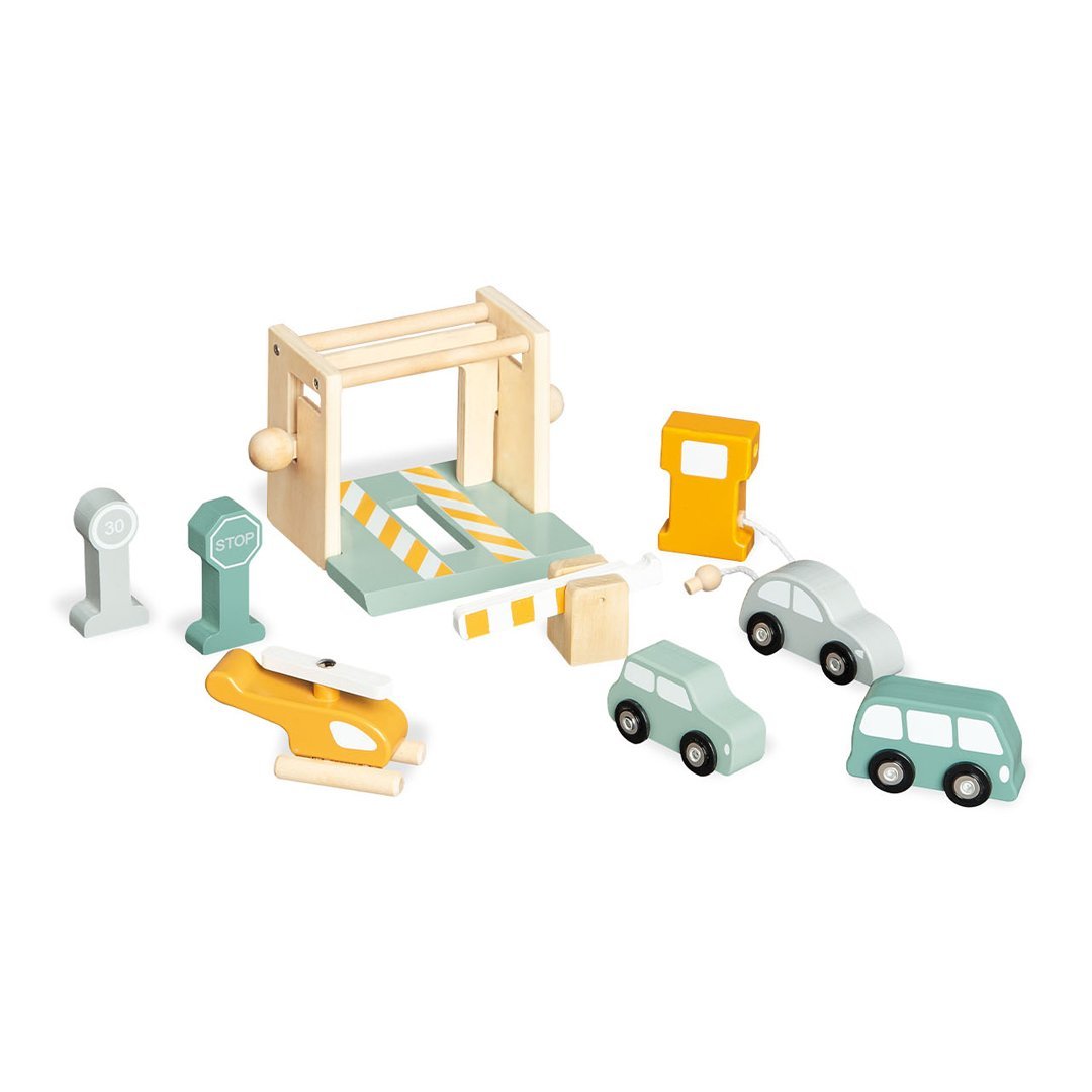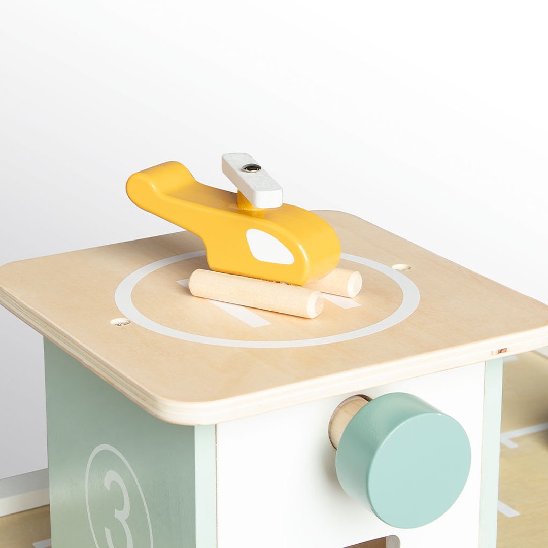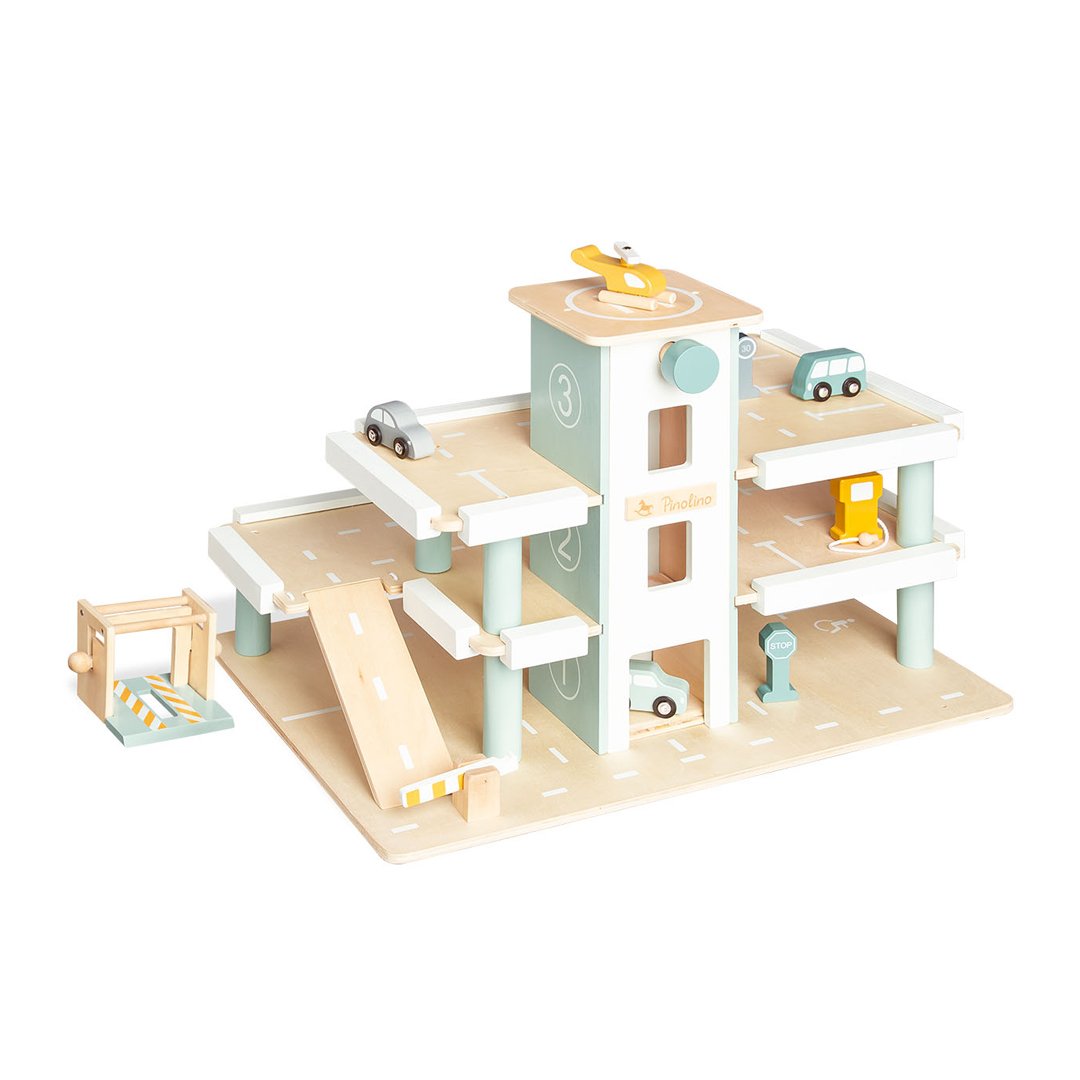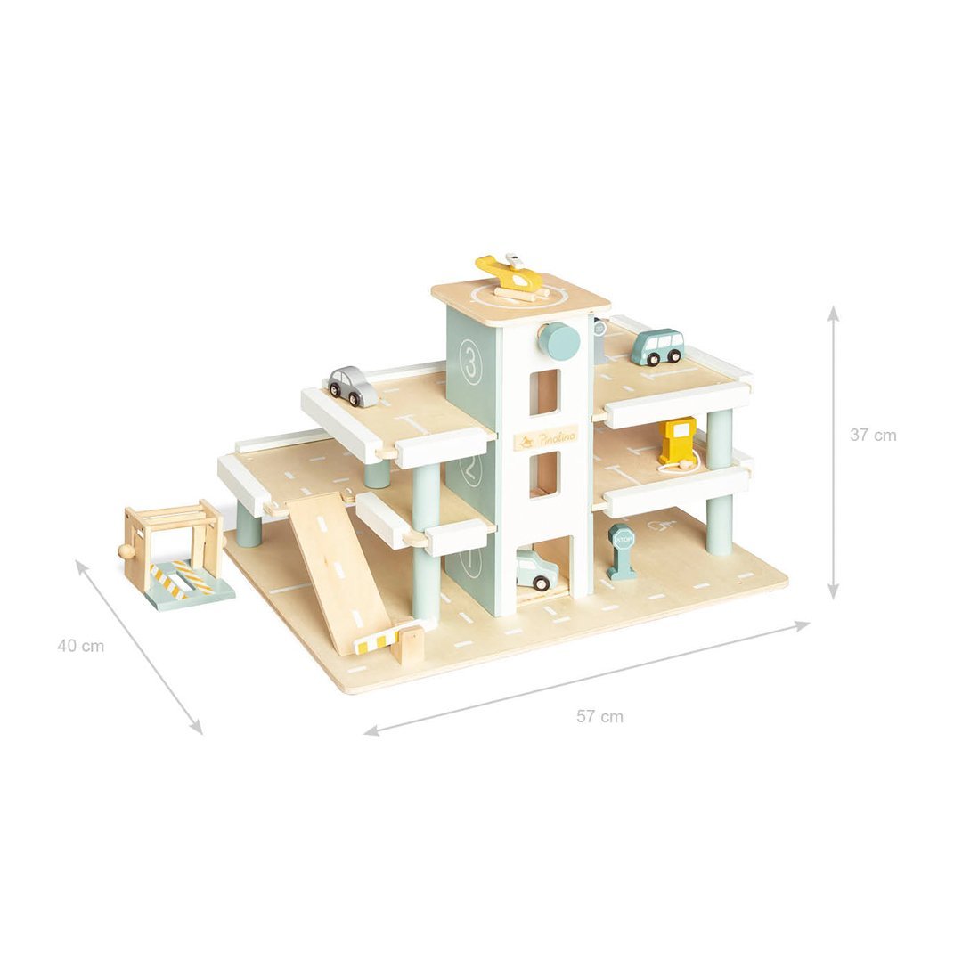 Incluye: 3 automóviles, 1 helicóptero y 5 piezas para ambientar. Medidas: 57 x 40 x 37 cm Pinolino: Los juguetes de madera Pinolino poseen una conducta ecológica global, sostenible en su producción. La madera utilizada ha sido certificada PEFC, y sólo utiliza madera proveniente de bosques exclusivamente europeos que son controlados y gestionados de manera responsable: por cada árbol talado, un árbol es plantado.