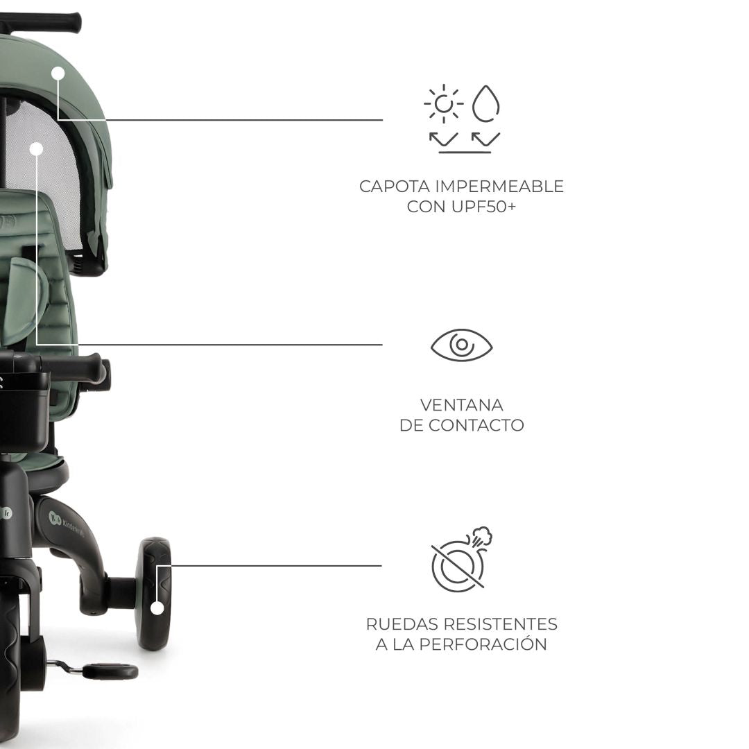 El triciclo dispone de un arnés de 5 puntos, barrera extraíble y manguitos antideslizantes. El modo de rueda libre permite que el niño aprenda a pedalear mientras que los padres controlan totalmente la dirección.