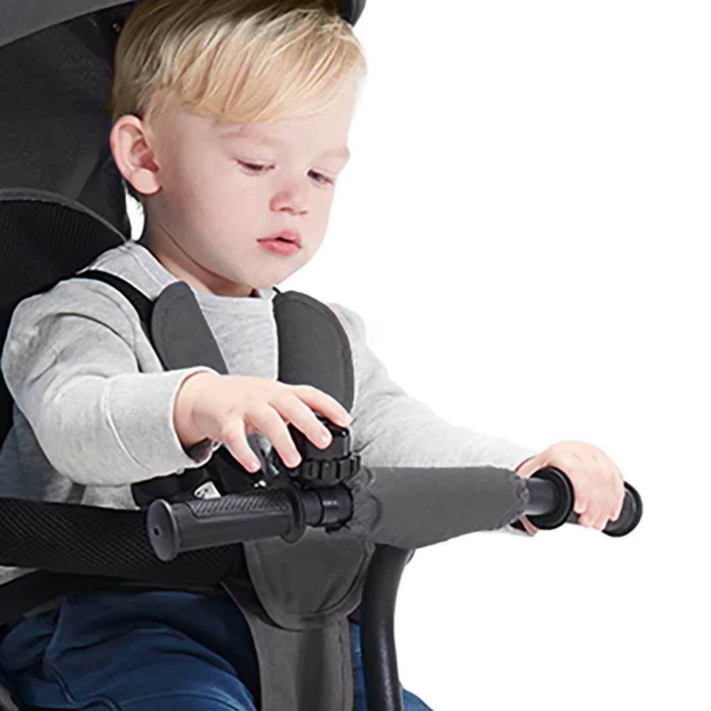 La bicicleta es segura y perfecta para dominar la conducción. Tiene un arnés ajustable con almohadillas, un práctico freno y una barra protectora con bloqueo central.