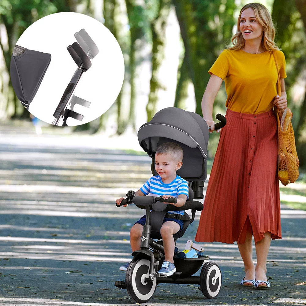 La bicicleta está equipada con una gran capota plegable. Puedes ajustarlo o quitarlo fácilmente en caso de necesidad. Protege al pequeño de la llovizna o el viento y le proporciona sombra durante los paseos a pleno sol.