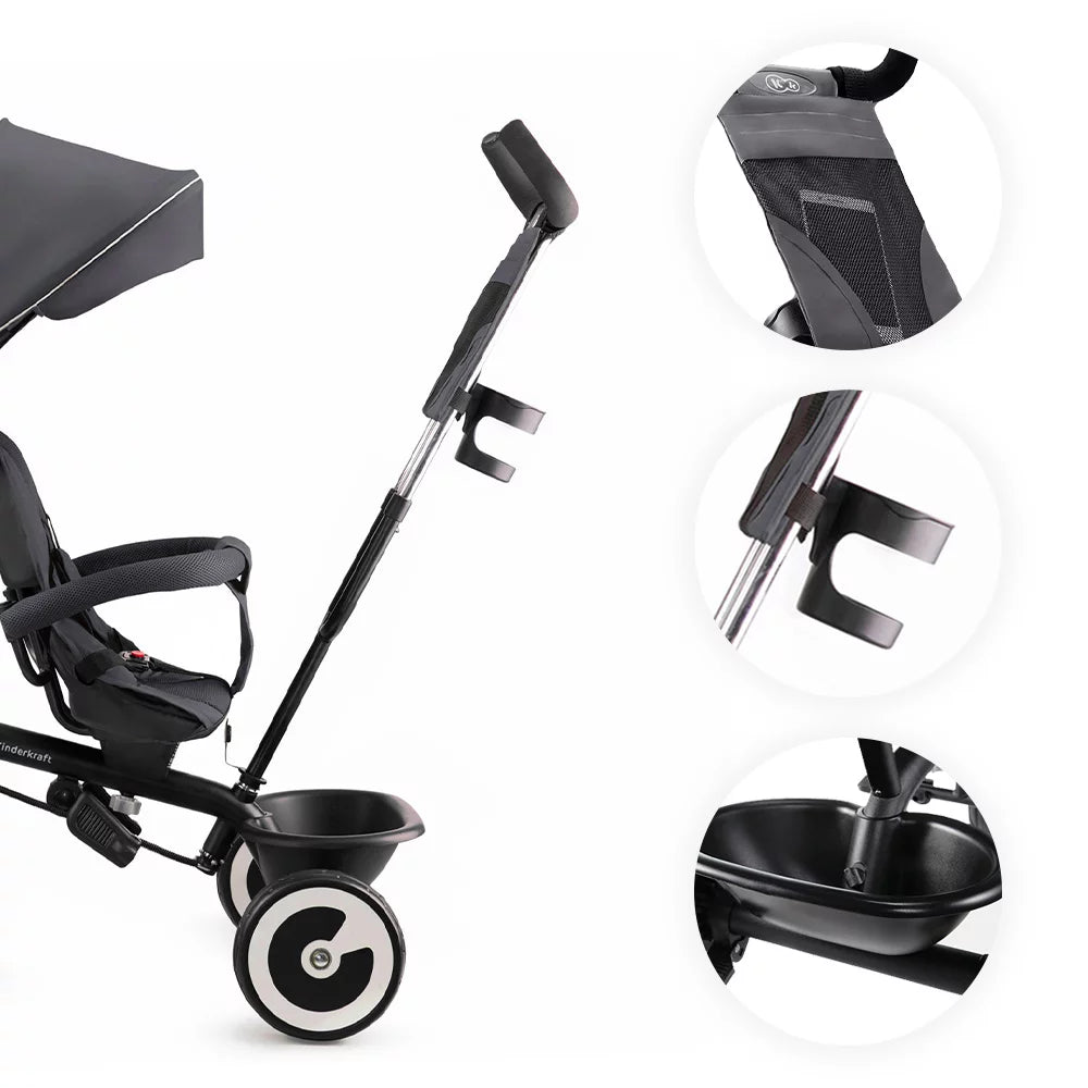La bicicleta viene con prácticos accesorios incluidos en el set: bolsa para objetos pequeños, cesta grande para juguetes detrás del asiento, portavasos para los padres, timbre.