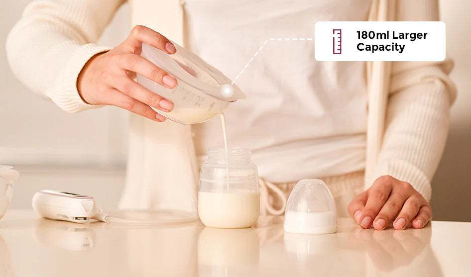 El extractor de leche V2 está equipado con un espacioso recolector de leche transparente de 230 ml que te permite observar y controlar fácilmente el volumen de leche. Garantiza que siempre esté al tanto de cuánta leche ha recolectado, lo que le brinda tranquilidad y confianza en su rutina de extracción.
