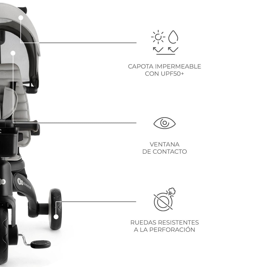 El triciclo dispone de un arnés de 5 puntos, barrera extraíble y manguitos antideslizantes. El modo de rueda libre permite que el niño aprenda a pedalear mientras que los padres controlan totalmente la dirección.