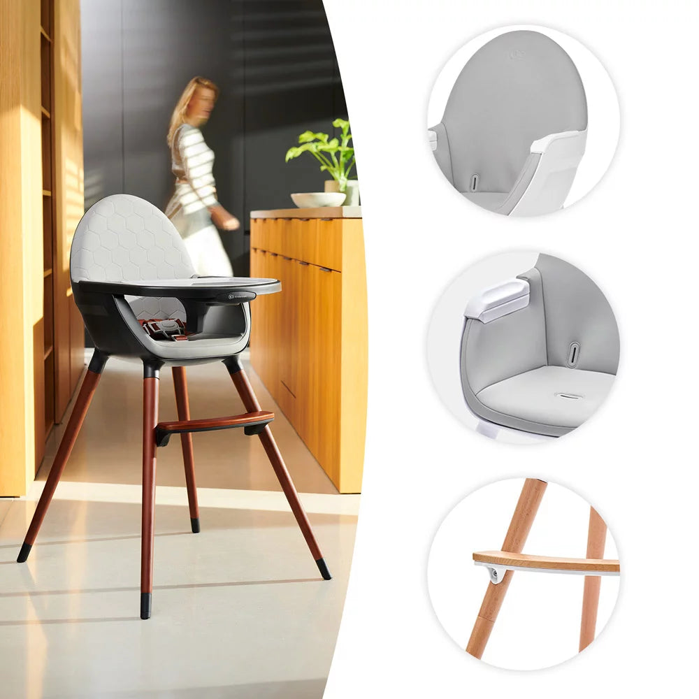 La silla de comer FINI ostenta un estilo moderno y elegante que combina con casi cualquier tipo de interior. FINI se convertirá rápidamente en una parte integral de tu hogar, con su precioso forro de ecocuero y sus esbeltas patas de madera.