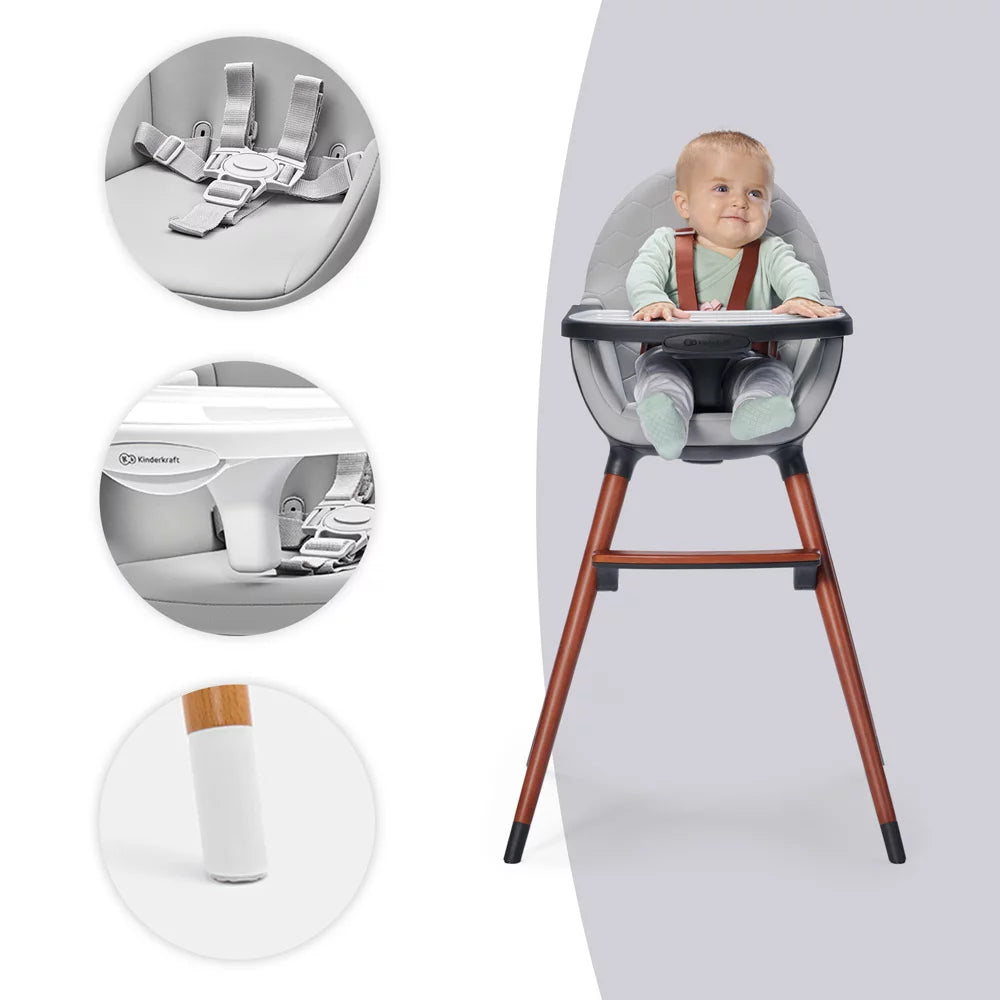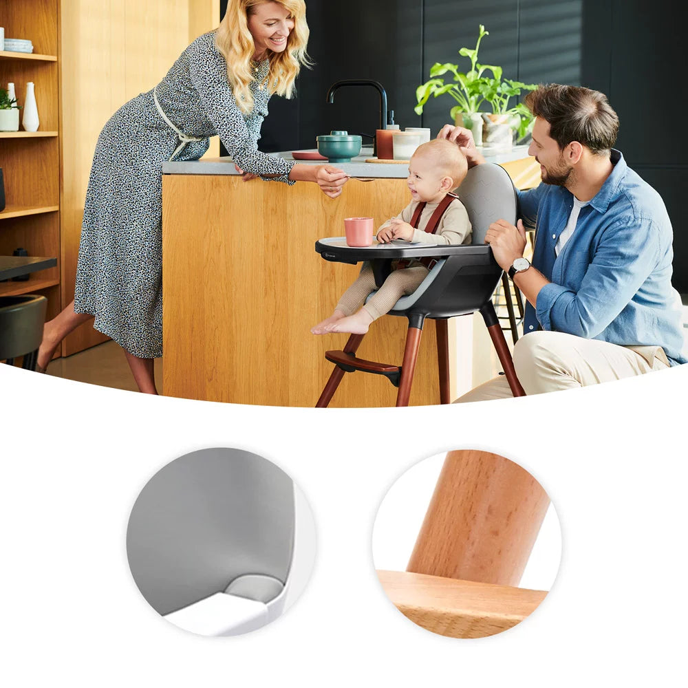 FINI es una silla de comer segura: está equipada con un arnés regulable de 5 puntos y un tope entre las patas. Por otro lado, las patas de la trona poseen un acabado antideslizante que garantiza estabilidad y seguridad por mucho que el peque se emocione jugando. Además, así no se raya el suelo.