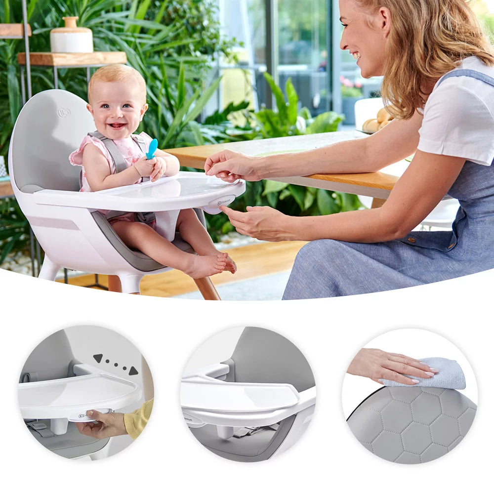 El forro de la silla de comer es de eco-cuero que se limpia fácilmente con un paño húmedo. Por su parte, la bandeja regulable tiene tablero extraíble, por lo que se puede lavar fácilmente en el fregadero.