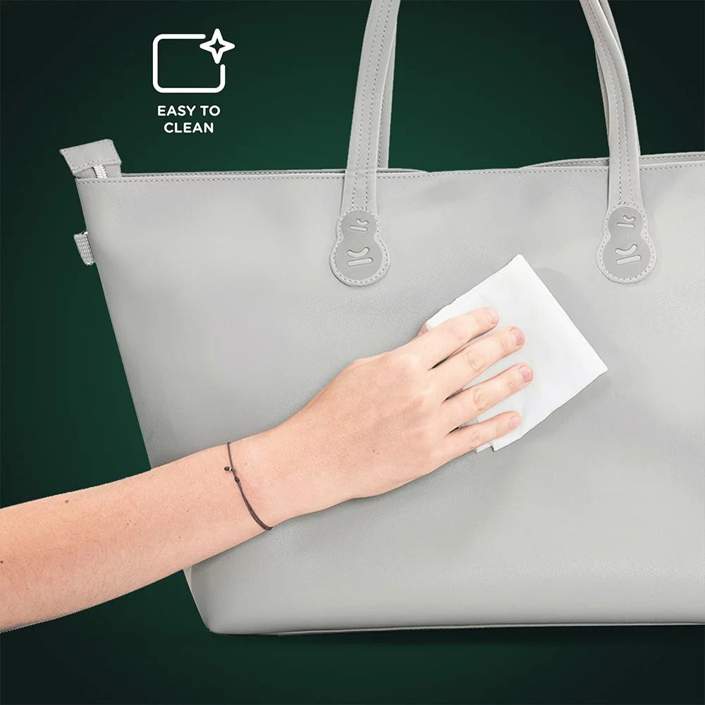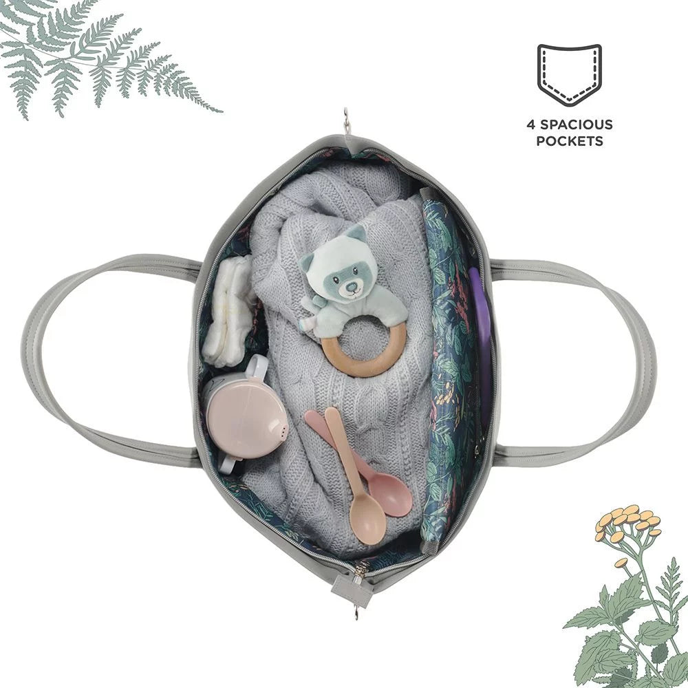 Incluye un mudador de viaje del mismo estilo, permitiendo cambiar pañales con higiene en cualquier situación. Este increíble bolso se puede llevar al hombro o enganchar al manillar del coche de paseo. Su diseño elegante, es parte de la colección Nature Vibes, combina con cualquier estilo cotidiano y otros accesorios de la colección.